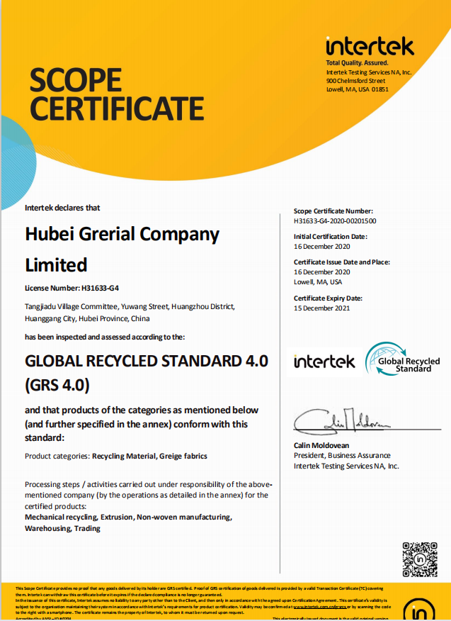 2020年12月16日,湖北綠宇環保有限公司通過國際環保認證機構管制聯盟的全球回收標準(GRS)嚴格審核,并取得GRS認證證書。