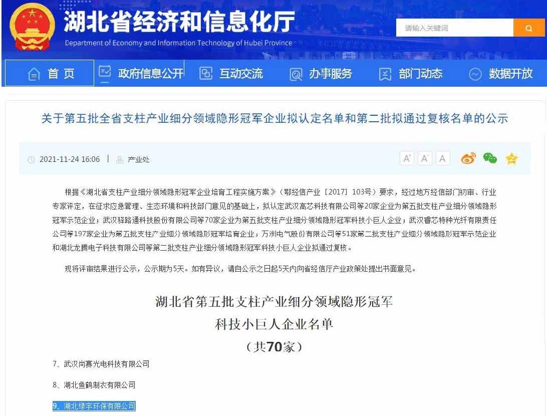 近期,湖北省第五批支柱產業細分領域隱形冠軍企業評審結果出爐,本次評審是根據《湖北省支柱產業細分領域隱形冠軍企業培育工程實施方案》(鄂經信產業[2017]103號)要求,經地方科經部門初審、行業專家評定,在征求應急管理、生態環境和科技部門意見的基礎上,湖北綠宇環保有限公司榜上有名,榮獲“第五批湖北省支柱產業細分領域隱形冠軍科技小巨人”稱號。